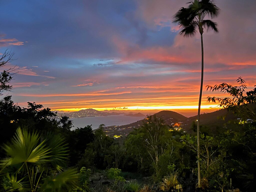 The lush, tropical Wild Palm property has a botanical garden look and feel, along with a stunning view across the Caribbean sea towards the twinkling night lights of St. Thomas.